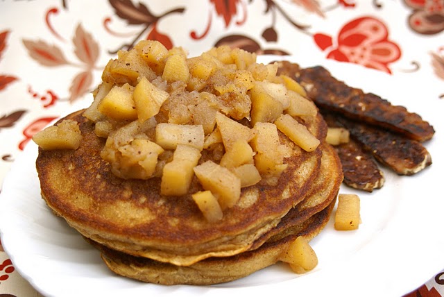 Your griddle pan should be nice and hot now. Lightly grease the pan with your margarine, spray or oil. Using a pour spout container or ladle, carefully pour some batter on your griddle pan. Spread it around into a circle with the back of a spoon or bottom of a ladle to the desired diameter. After a few minutes the top, uncooked side will begin to set, creating little bubbles around the edges. Using a spatula, you can carefully lift up the edge and peek for doneness, if you wish. If the batter feels pretty set, you can give them a flip. If the pancake isn’t golden brown enough, turn the heat up a little more. If it is too brown, turn your heat down a little. When done, remove from pan and stack on a plate. Pancakes can be kept warm in a 200 degree oven until ready to serve. Re-grease your griddle and continue with the rest of the batter until it is all gone. Serve with warm apple compote and/or real maple syrup and vegan butter, such as Earth Balance.
